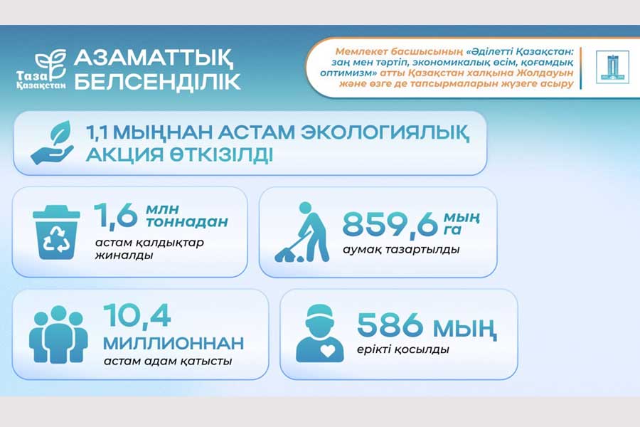 Президенттің «Әділетті Қазақстан: заң мен тәртіп, экономикалық өсім, қоғамдық оптимизм» Жолдауын және Мемлекет басшысының өзге де тапсырмаларын жүзеге асыру шеңберінде «Таза Қазақстан» экологиялық бастамасы басталғаннан бері республика бойынша 1 мыңнан астам экологиялық акция өткізілді, оған 10,4 млн-нан астам адам қатысты, оның ішінде 586 мың ерікті.